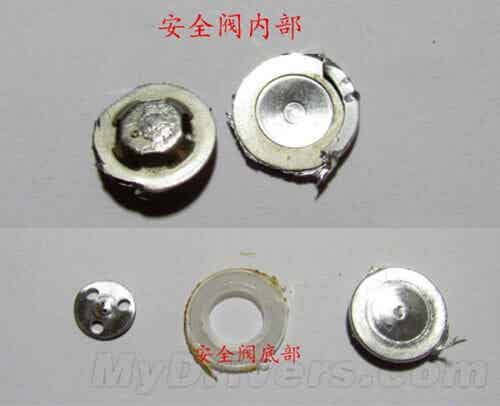然后,用尖嘴鉗從電芯蓋帽位置暴力撕開,將正極與負極鋼殼分離,露出安全閥和卷包的正負極材料。