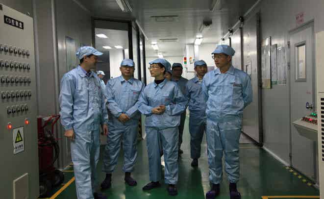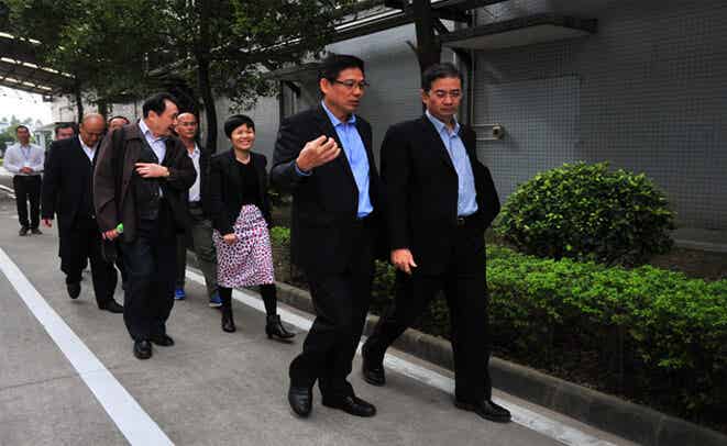 圖二:吳曉暉總經(jīng)理攜其余廣新控股領(lǐng)導(dǎo)進入生產(chǎn)車間進行參觀考察
