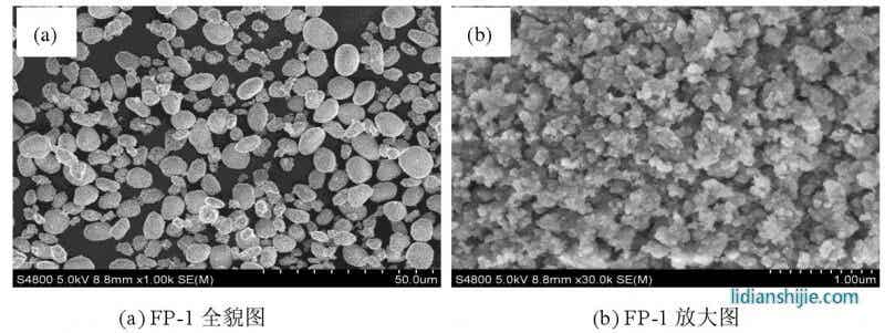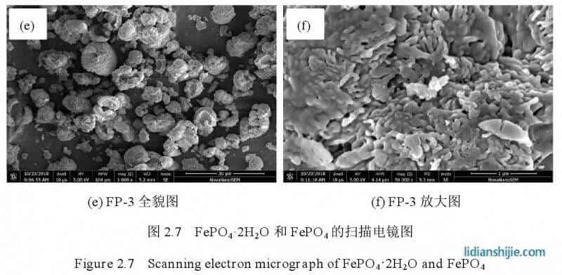 圖 2.7 是 Fe PO4·2H2O 和無水 Fe PO4的掃描電鏡圖,與氨水沉淀制備的十分相似,只是在具體細節(jié)上有所區(qū)別。控制結(jié)晶法制得的 Fe PO4·2H2O 呈類球形;經(jīng)過陳化晶化處理,F(xiàn)e PO4·2H2O 顆粒明顯增大,變成球殼狀,具有微納米結(jié)構(gòu);600 ℃焙燒處理制得的無水 Fe PO4基本保持了燒前 Fe PO4·2H2O 的形貌,仍為球殼狀。