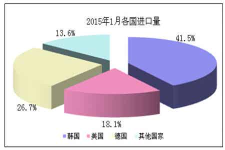 據(jù)1月份分國別進口數(shù)據(jù)顯示,自韓國、美國、德國三國共進口多晶硅8040噸,占總進口量的86.4%,其中從韓國進口量為3867噸,占總進口量的41.5%;從美國進口量為1683噸,占總進口量的18.1%;從德國進口量為2490噸,占總進口量的26.7%;其他地區(qū)進口量為1269噸,占總量的13.6%。