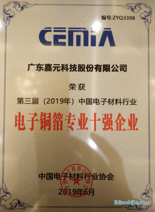 近日,廣東嘉元科技股份有限公司(以下簡稱“公司”)收到中國電子材料行業(yè)協(xié)會頒發(fā)的“第三屆(2019年)中國電子材料行業(yè)五十強企業(yè)”和“第三屆(2019年)中國電子材料行業(yè)電子銅箔專業(yè)十強企業(yè)”榮譽稱號。