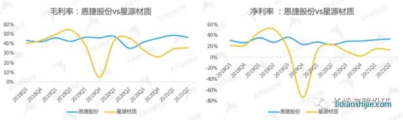 2、行業(yè)毛利率最高,35%-50%之間,媲美食品飲料行業(yè)平均毛利率,其中恩捷股份以濕法隔膜的生產(chǎn)制造為主,毛利率45%-50%,凈利率25%-35%,對比可比公司星源材質(zhì)毛利率和凈利率,恩捷股份盈利行更加穩(wěn)定,同時在成本和費用端具備明顯的優(yōu)勢;