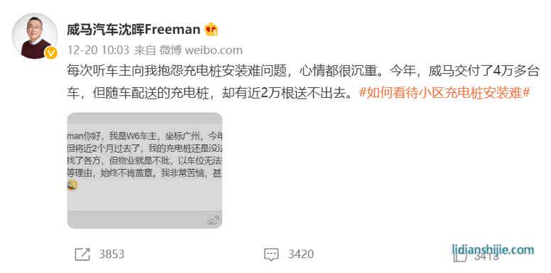 在蔚來NIO Day發布會后兩天,沈暉公開“吐槽”私人充電樁安裝難的問題。那些無法安裝充電樁的威馬車主原本可以選擇晚上回到小區充電,第二天正常出行?,F在只能到外面找公共充電樁充電,要么就等上1-2個小時把電充滿,要么就先打車回家。從這個角度講,上述威馬車主就是買了“焦慮”。