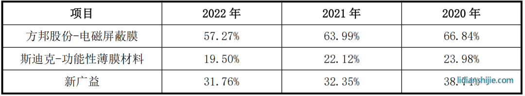 報告期內(nèi),新廣益抗溢膠特種膜的毛利率分別為 33.09%、 28.51%、28.65%;強耐受性特種膜的毛利率分別為 50.84%、 41.67%、39.73%。與同行業(yè)上市公司之間存在一定差異,但產(chǎn)品方面同樣具有較大差異。