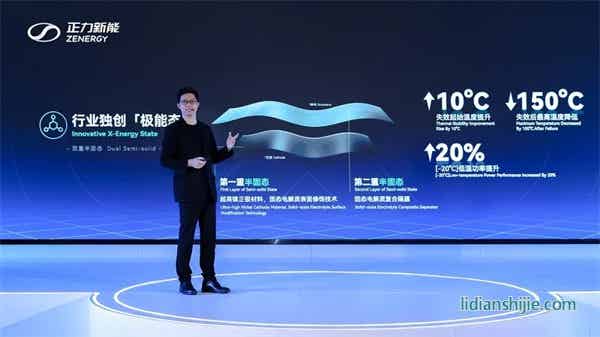 極能態(tài):即雙重半固態(tài)電芯技術(shù)。正力新能研發(fā)了超高鎳正極材料的固態(tài)電解質(zhì)表面修飾技術(shù)和固態(tài)電解質(zhì)復合隔膜技術(shù)。得益于此,大圓柱電芯的失效起始溫度提升10°C,失效最高溫度降低150°C。功率性能改善上,零下20°C 低溫功率提升了20%。