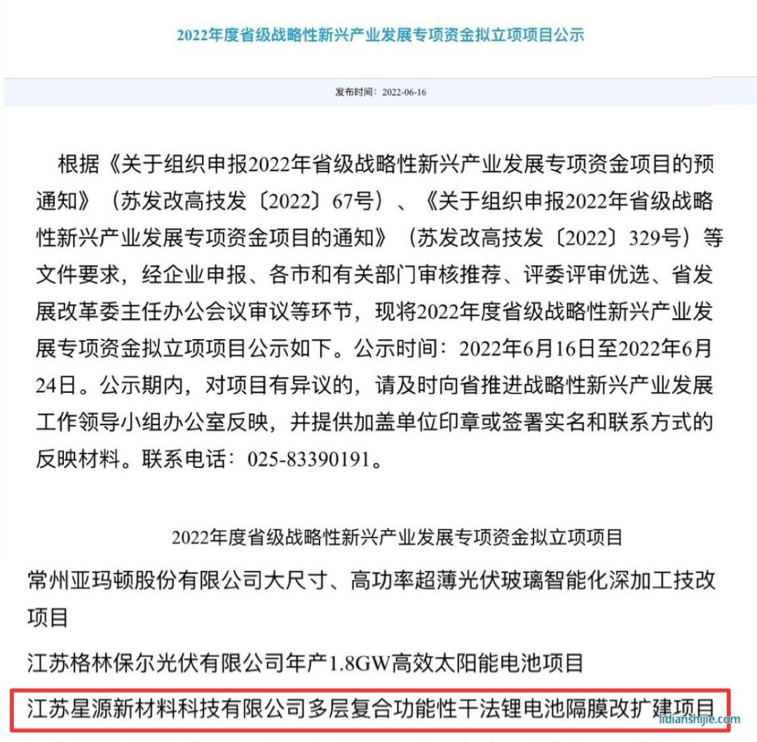 6月16日,星源材質全資子公司江蘇星源“多層復合功能性干法鋰電池隔膜改擴建項目”入選2022年度江蘇省戰略性新興產業發展專項資金擬立項項目,該項目將獲省級專項資金一千余萬元。
