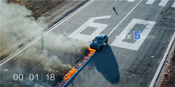 第二項測試兇險非常,需要將整輛車開到一條長長的“火路”上,車輛以5km/h的速度前進(jìn),由炙熱的明火直接燒烤電池包長達(dá)1分多鐘