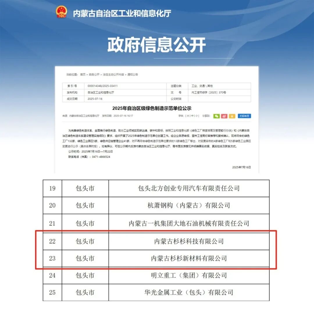2025年7月16日,經(jīng)內(nèi)蒙古自治區(qū)工業(yè)和信息化廳發(fā)布《2025年自治區(qū)級(jí)綠色制造示范單位公示》,內(nèi)蒙古杉杉科技有限公司(青山工廠)及內(nèi)蒙古杉杉新材料有限公司(九原工廠)雙雙獲評(píng)內(nèi)蒙古自治區(qū)級(jí)“綠色工廠”,使杉杉省級(jí)以上綠色工廠再“+2”。