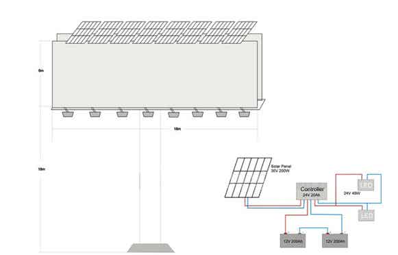 電池板采用高效的單晶組件,統(tǒng)一固定安裝在兩幅廣告牌頂層,以傾斜15~30度角度朝向太陽(yáng),以達(dá)到陽(yáng)光最佳照射角度,同時(shí),可以利用自然風(fēng)、雨水沖刷電池板表面,避免灰塵沉積而影響組件的發(fā)電效率。每面廣告牌安裝8盞LED投光燈,簡(jiǎn)距3米,燈臂伸展長(zhǎng)度為2.5米,向上投射。