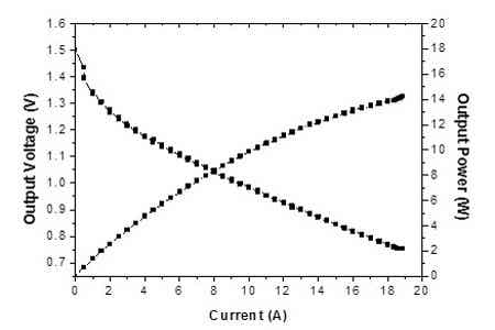中國科學(xué)院寧波材料技術(shù)與工程研究所動(dòng)力鋰電池工程實(shí)驗(yàn)室在優(yōu)化陰極空氣擴(kuò)散電極的結(jié)構(gòu)與制備工藝,以及開發(fā)高性能的錳氧化物氧還原催化劑的基礎(chǔ)上,成功研制出1000Wh鎂空氣電池樣機(jī),詳見圖1所示。該電池由5個(gè)單體電池串聯(lián)而成,以AZ31鎂合金為陽極,以10%的NaCl溶液為電解液,以上述空氣擴(kuò)散電極和錳氧化物催化劑為陰極。該鎂空氣電池的外觀尺寸為200×150×150 mm3,重量為2.3 kg,能量密度可達(dá)430 Wh/kg,最大輸出功率可達(dá)80W,其單體電池的I-V曲線如圖2所示。上述鎂空氣電池具有較好的商業(yè)化前景,可應(yīng)用為野外供電電源、移動(dòng)電源、備用電源和應(yīng)急電源等。