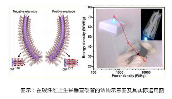 中國科學院蘇州納米技術與納米仿生研究所國際實驗室張躍鋼團隊近期結合靜電紡絲技術和高溫熱解技術,制備在一維碳纖維上生長垂直碳管的三維多級結構,并對其電化學性能進行研究。在碳纖維上生長垂直碳納米管陣列,提高了碳纖維的比表面積、導電性、多孔性以及電解液的浸潤性,同時利用離子液3體電解液代替傳統的水系電解液將其輸出電壓擴展到4V,有效提高了柔性電容器的能量輸出。以離子液體為電解液所組成的柔性電容器在30°C,電流密度為0.5A/g的條件下,其比容量達到70.7 Wh/kg, 在60°C,電流密度為1A/g的條件下,其比容量達到98.8 Wh/kg。用該材料組裝的柔性電容器也表現出超高的循環穩定性,在充放電循環20000次后,其容量保持率為97%。該三維柔性碳電極材料的優異性能得益于,利用垂直碳管類儲存和積累電荷,而碳纖維導電基底運輸電荷形成一個三維導電網絡,極大地促進電子和離子的移動速度,減少材料本身電阻。相關成果已作為封面文章發表在Chemistry of Materials(DOI: 10.1021/cm 503784x)雜志上。