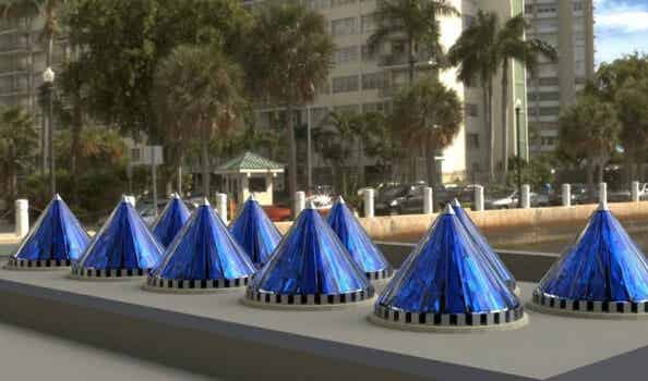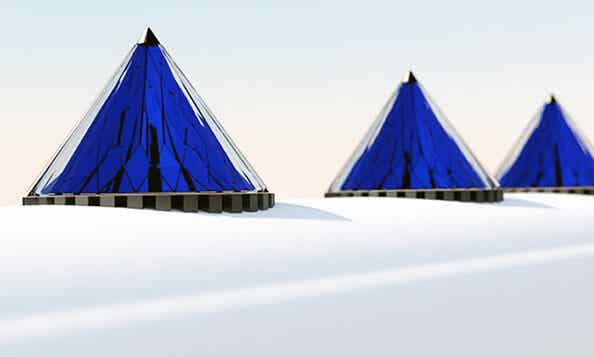 “旋轉單元”比靜態平板太陽能電池板的發電能力提高20倍。使用聚光透鏡和動態旋轉周期的組合,項目實現兩個圓錐形的鏡片組成的數以百計的三角光伏電池,從太陽與旋轉板均勻地收集光。
