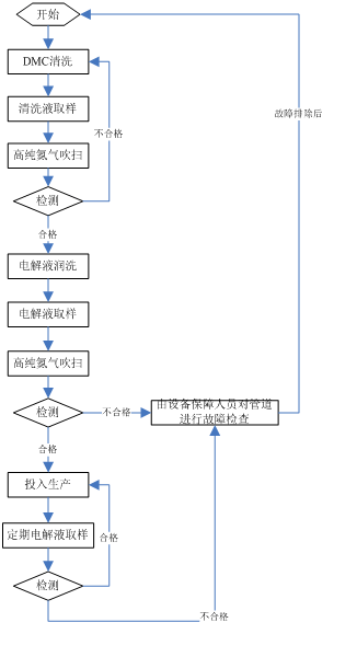 為保證系統(tǒng)可靠性,在使用過程中要對(duì)該系統(tǒng)進(jìn)行動(dòng)態(tài)監(jiān)控,電解液水份抽樣檢測(cè)頻次不低于2次/天,離子檢測(cè)不低于2次/月。具體操作步驟如下圖1所示: