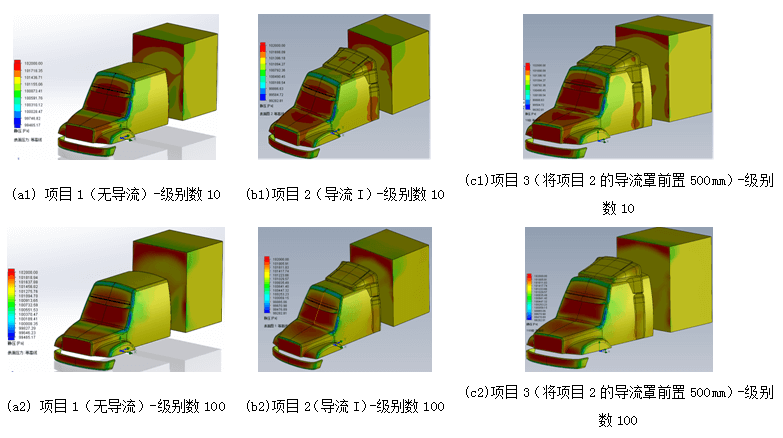 本文采用專業的計算流體動力學(CFD)分析軟件SolidWorks Flow Simulation對一汽解放柳州特種汽車有限公司的一款長頭型重卡車車頭進行風阻優化,首先設計了三種車頭設:(1)項目1:無導流罩;(2)項目2:舊式導流罩;(3)項目3:新型導流罩(將項目2的導流罩前置500mm),詳見圖1;再對三個項目進行外流場分析,最終將整車的外流場風阻系數Cd由項目1的0.784降低至項目2的0.689,再降低至項目3的0.571。