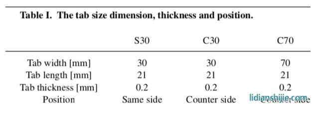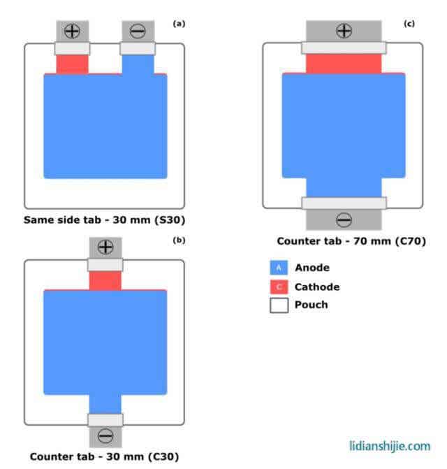 為了驗(yàn)證模型的有效性,作者采用了三種結(jié)構(gòu)的軟包電池對(duì)實(shí)驗(yàn)結(jié)果進(jìn)行驗(yàn)證,三種電池的正極材料均為NCM622材料,負(fù)極均為石墨材料,電池容量為16Ah,尺寸為117mm×101mm×11.5mm,其正極、負(fù)極和隔膜的結(jié)構(gòu)和尺寸完全一致,僅極耳結(jié)構(gòu)和位置不同(如下圖所示),三種電池的極耳結(jié)構(gòu)詳細(xì)信息如下表所示。
