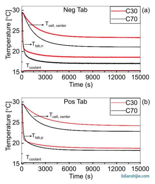 下圖為實(shí)驗(yàn)中測(cè)量的電池中間位置表面、電池極耳和冷卻池的溫度變化曲線,從下圖a(負(fù)極極耳冷卻)中能夠看到相比于窄極耳的C30電池,寬極耳設(shè)計(jì)的C70電池在中心位置表面溫度低2.3℃,在負(fù)極極耳位置低1.5℃,從下圖b(正極極耳冷卻)能夠看到寬極耳設(shè)計(jì)的C70電池在冷卻效果上仍然具有優(yōu)勢(shì),在中心位置C70電池的溫度低2℃,極耳位置低0.7℃,表明寬極耳設(shè)計(jì)能夠有效的減少電池的熱阻,同時(shí)相比于正極極耳散熱,負(fù)極極耳冷卻熱阻較小,也能夠提升散熱效果。