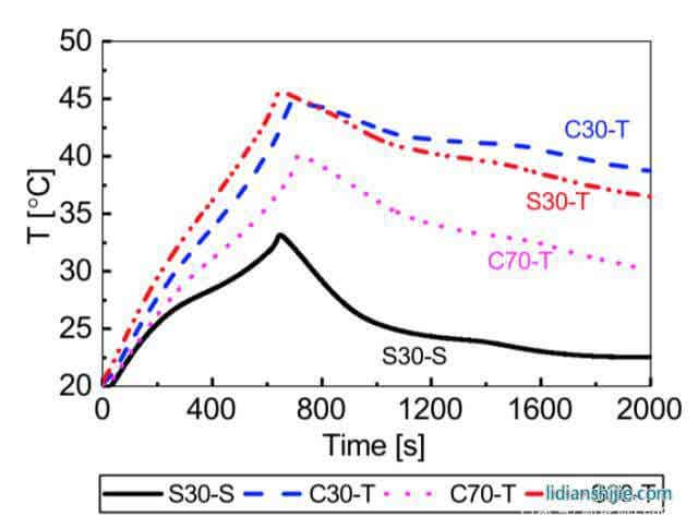 為了驗(yàn)證不同的散熱方式對(duì)鋰離子電池表面溫度的影響,作者對(duì)S30電池采用表面冷卻的方式進(jìn)行散熱,然后對(duì)于S30、C30和C70三個(gè)電池進(jìn)行極耳散熱,所有電池首先以1C進(jìn)行充電,然后以5C倍率進(jìn)行放電,接著進(jìn)行2C充電,在這一過(guò)程中電池表面溫度變化的如下圖所示。