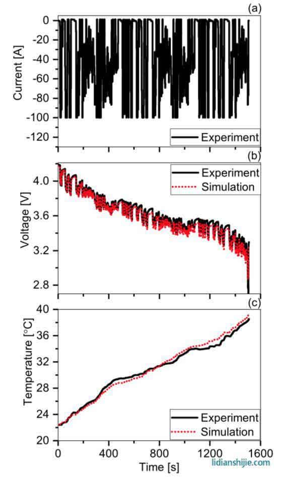 從上面的實(shí)驗(yàn)數(shù)據(jù)可以看到盡管寬極耳設(shè)計(jì)能夠有效的提升極耳散熱的效果,但是相比于表面散熱其最高溫度仍然要高7℃,為了進(jìn)一步優(yōu)化極耳散熱效果,作者采用二維模型對(duì)電池進(jìn)行了模擬仿真。下圖為針對(duì)C70電池進(jìn)行的模擬仿真結(jié)果,從下圖c能夠看到仿真得到的電池溫度變化曲線與電池實(shí)際的溫度變化曲線之間高度一致,這表明該模型能夠很好的模擬鋰離子電池在實(shí)際工作中的溫度變化情況。