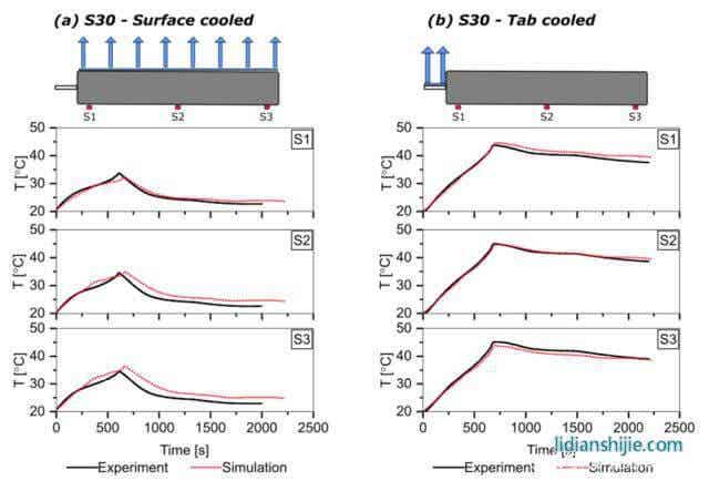下圖為采用模型模擬的三種電池分別采用表面散熱、極耳散熱方式進(jìn)行熱管理時(shí)電池的溫度變化曲線,對(duì)于采用表面散熱的S30電池,模型得到的溫度與實(shí)際的溫度在S3位置最大誤差為1.5℃,對(duì)于采用極耳散熱的C30電池在S1和S3位置的最大誤差分別為-1.5℃和1.9℃,對(duì)于采用極耳散熱的S30和C70電池模型仿真結(jié)果與實(shí)際結(jié)果之間相差不到1℃,表明該模型能夠提供可接受精度的溫度預(yù)測(cè)。