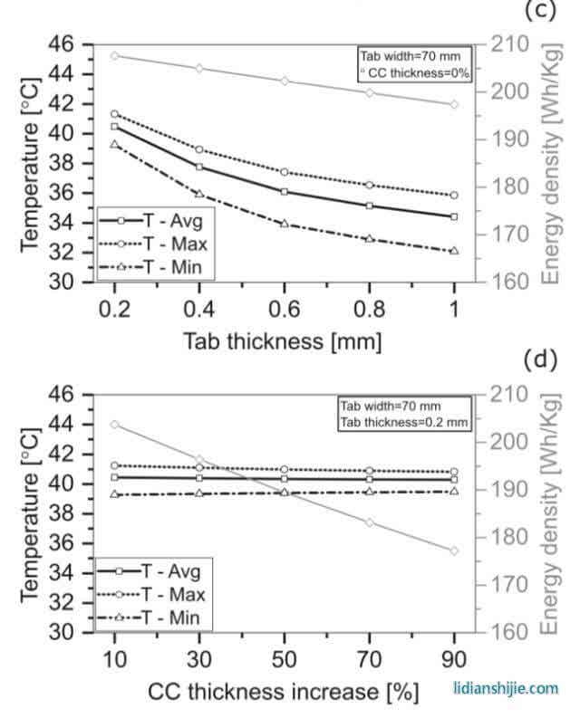 從下圖c可以看到當(dāng)極耳的厚度從0.2mm增加到1mm,電池在放電結(jié)束后的平均溫度從40.4℃降低到了34.4℃,同時(shí)電池內(nèi)部在長(zhǎng)度方向上的溫度梯度也從2℃增加到了3.7℃,由于極耳重量的增加,電池的重量能量密度從210Wh/kg下降到了197Wh/kg。