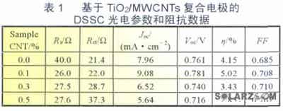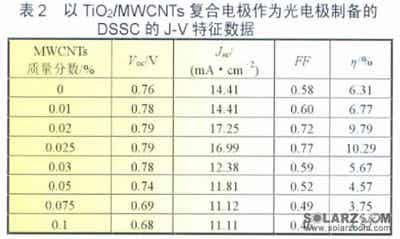 需要說明的是表2和上面的表1中MWCNTs含量都是質(zhì)量分?jǐn)?shù)為0.1%時(shí)開路電壓、短路電流、填充因子(FF)和轉(zhuǎn)換效率的值,都有很大的差距,這主要是因?yàn)椴煌娜俗鰧?shí)驗(yàn)時(shí)采用的材料合成方法、燒結(jié)溫度、染料及膜厚度等實(shí)驗(yàn)條件各不相同,這種外界條件上的差異直接造成了實(shí)驗(yàn)結(jié)果的迥異。