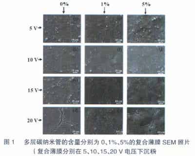 圖1是多層碳納米管的含量分別為0、1%、5%時(shí)的復(fù)合薄膜SEM照片,從圖中可以看出在MWCNTs含量相同時(shí),電壓越大,裂紋越大,20V電壓下制備的復(fù)合薄膜出現(xiàn)的裂縫最大,說明電壓過大不利于薄膜的沉積。在相同電壓下,隨著MWCNTs含量的增加,復(fù)合電極的裂縫變得越來越小,含5%MWCNTs的復(fù)合電極在5、10V時(shí)幾乎沒有裂縫,說明在復(fù)合電極中增加MWCNTs的含量可以減少薄膜的表面裂縫,改善電極微結(jié)構(gòu)。