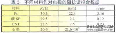 S.Gagliardi等人分別研究了石墨、碳納米粉和碳納米管作為對(duì)電極時(shí)電池DSSC的阻抗譜,阻抗擬合數(shù)據(jù)如表3所示。從表中數(shù)據(jù)可以看出,碳納米管的電荷傳遞電阻(Rct)的值在2.4~2.5Ω,而Pt催化電極的卻達(dá)到22.4Ω,多層碳納米管比Pt電極有更低的串聯(lián)電阻(Rs)和電荷傳遞電阻,用它作為DSSC的對(duì)電極將使填充因子和效率大大提高。這個(gè)現(xiàn)象可解釋為納米結(jié)構(gòu)的碳不僅能提高表面的電化學(xué)活性,也能提高碘/碘化物氧化還原對(duì)的催化活性。石墨的串聯(lián)電阻和電荷傳遞電阻都較大,不適合替代Pt催化電極。
