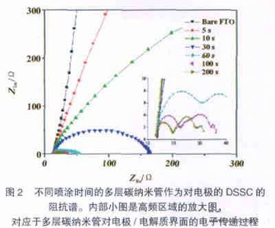 EaswaramoorthiRamasamy等人研究了多層碳納米管作為DSSC的對(duì)電極時(shí),碳膜噴涂時(shí)間對(duì)電池性能的影響。將100mg的多層碳納米管加入到100mL的無水乙醇中并用超聲波處理1h,然后用便攜式噴槍將溶液噴涂在120℃的FTO玻璃襯底上,按照噴涂時(shí)間5~200s將薄膜分成六種。噴涂時(shí)間決定了碳膜的厚度,噴涂時(shí)間越長,碳膜越厚。工作電極包含了兩層:約15μm厚的TiO2層和4μm厚的光散射層,TiO2電極在500℃燒結(jié)30min,然后浸入到5×104mol/L的N719染料中24h,待染料浸入到TiO2電極中后再用無水乙醇沖洗,然后用噴涂好的多層碳納米管作為對(duì)電極組裝電池,用絕緣膠將電極材料密封起來,注入液體電解質(zhì)進(jìn)行電池性能測試。圖2是不同噴涂時(shí)間的碳納米管作為對(duì)電極的DSSC阻抗譜,從圖中可以看出,隨著碳納米管噴涂時(shí)間的變長,電荷轉(zhuǎn)移電阻下降,噴涂200s時(shí)對(duì)應(yīng)的電荷轉(zhuǎn)移電阻為2.34Ω,這也說明,碳膜越厚,電池性能越佳,最大光電轉(zhuǎn)換效率為7.59%。
