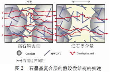 將CNTs與其他材料復(fù)合還可以替代鍍Pt的導(dǎo)電玻璃襯底,從而進(jìn)一步降低電池的制作成本。例如,Ming-YuYen等人用塊狀模塑料(BMC)過程制備含石墨的碳納米管復(fù)合層,該復(fù)合層用作DSSC的對(duì)電極層,Voc=0.69V,Jsc=10.11mA/cm2,F(xiàn)F=0.68,η=4.73%,而用普通的鍍Pt玻璃襯底,Voc=0.69V,Jsc=7.73mA/cm2,F(xiàn)F=0.7,η=3.74%。說明用不同比例的石墨和MWCNTs聚合物復(fù)合鍍層作為DSSC的對(duì)電極層性能優(yōu)于用鍍Pt的傳導(dǎo)玻璃,當(dāng)石墨含量增加時(shí),復(fù)合層電阻從6.7mΩ減小到1.7mΩ,復(fù)合層在最佳水(80%石墨裝載)時(shí)有更低的電池電阻,低的制作成本和高的電池性能。圖3是復(fù)合層的假設(shè)微結(jié)構(gòu)描述,是基于實(shí)驗(yàn)結(jié)果的基礎(chǔ)上對(duì)不同復(fù)合層傳導(dǎo)路徑的模擬圖,在石墨的邊界存在MWCNT區(qū)域,如果石墨界面間距小,加上電壓就會(huì)出現(xiàn)很多的電流傳輸路徑[如圖3(左)所示],電子傳遞電阻相對(duì)較小;相反的,如果石墨界面間距大,加上電壓只能出現(xiàn)少數(shù)的電流傳播路徑[如圖3(右)所示],電子傳遞電阻相對(duì)較大。所以,當(dāng)石墨含量增加時(shí),層間間距變小,復(fù)合層電阻會(huì)減小。用石墨和多層碳納米管復(fù)合層作為DSSC的對(duì)電極層比普通鍍Pt玻璃襯底電阻低,花費(fèi)少,性能高,是理想的替代材料。
